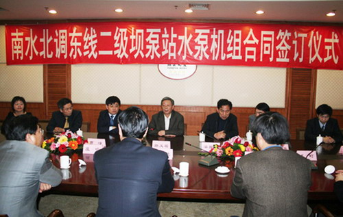 3月12日,南水北調(diào)東線一期工程二級壩泵站簽字儀式在山東省濟南頤正大廈隆重舉行;山東省水利廳領導、淄博市領導及荏原博泵李正民副總帶隊參加了簽字儀式。荏原博泵在南水北調(diào)主線泵站中標,標志著我公司大型泵的制造將有新的突破。