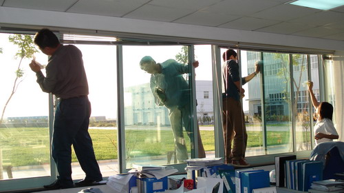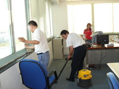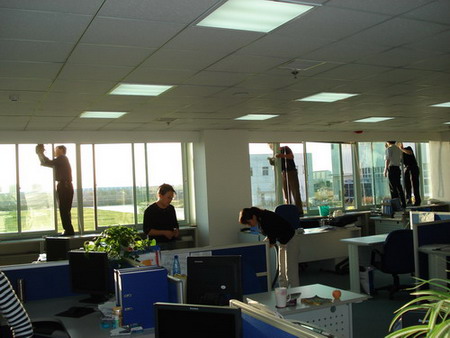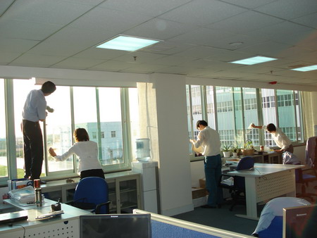 業(yè)務技術黨支部共32人參加勞動,支部書記梁文運與支委們首先對負責清理的二樓、四樓場所及會議室的窗戶和地面進行了詳細分工,使大家在有限的時間內(nèi)有條不紊的進行。特別是二樓只有13人參加勞動,衛(wèi)生清理工作量比較大,但大家都沒有任何怨言。在勞動中,鄭素紅、房凝、徐寶紅、牛愛香四位女同志連續(xù)工作一個半小時打掃了二樓的所有辦公室和會議室的地面。李正民副總和李同華副總率先帶頭擦起了窗戶,在擦完窗戶后大家又把所有的窗臺和地面的衛(wèi)生死角清理了一遍。