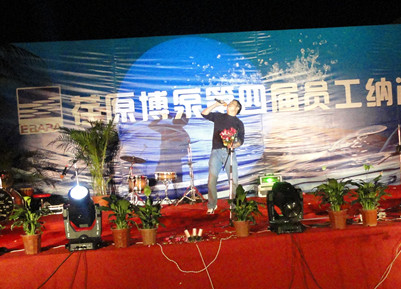 18:30分,晚會節(jié)目正式開始,首先在晨曦樂隊激情飛揚的搖滾歌曲聲中拉開了晚會的序幕。晚會節(jié)目有獨唱、小合唱、舞蹈等等,演員們的精彩表演,博得了員工們陣陣掌聲和喝彩。特別是生產部門女職工排練的舞蹈,動感十足,展示了女員工的多姿多彩的精神風貌。常務副總經理王正軍的一曲豪邁的《紅旗飄飄》,抒發(fā)了荏原博泵員工的愛國情懷;北京事務所的王信東部長帶來了抒情歌曲《別問》;王虹權、袁磊、趙喜鵬、周新菊、肖旭、竇群、蔣祺、張雷雷、徐道義、董旭光等員工先后表演了自己準備的節(jié)目;職工子女表演的拉丁舞更是把晚會的氣氛推向高潮。