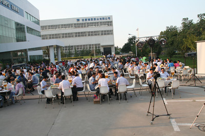 17:30分, “第四屆員工納涼晚會”正式開始。首先是員工聚餐。近400名員工,伴著歡快的樂曲聲,推杯換盞,大快朵頤。公司總經理志賀進、常務副總經理王正軍等公司領導走入員工中,與員工們親切交談,敬酒祝愿,整個會場洋溢著一張張歡樂的笑臉。